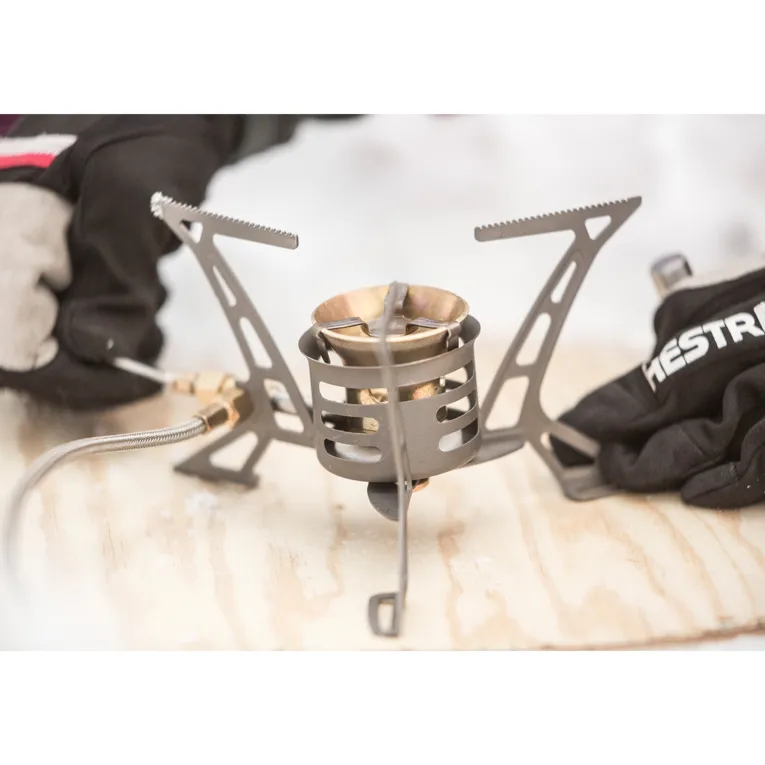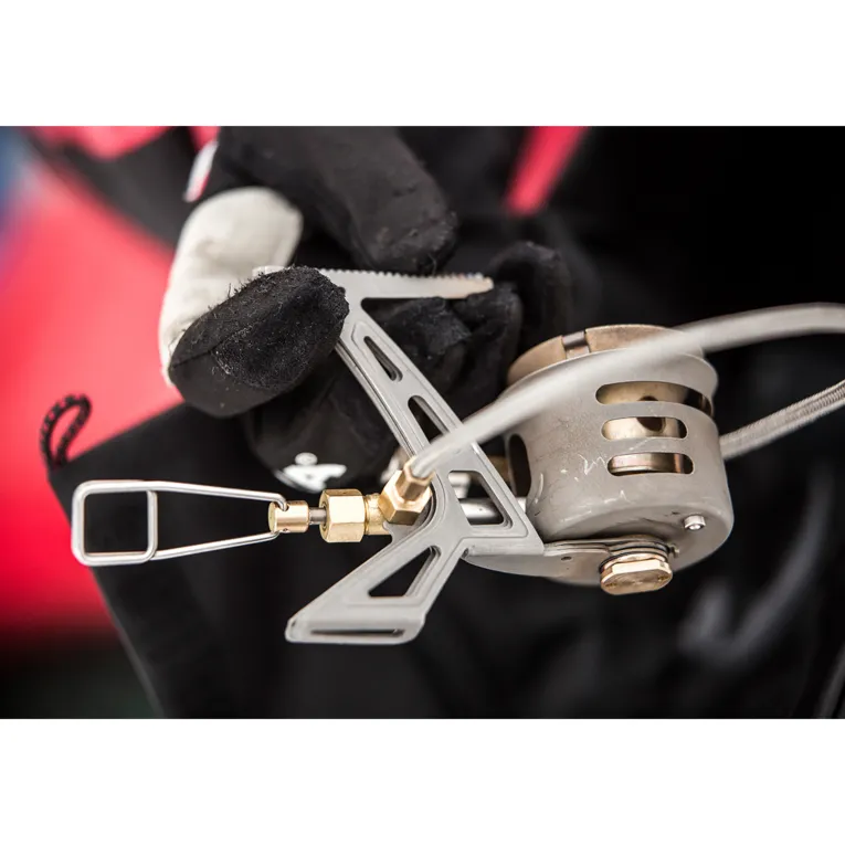 Wie sein großer Bruder, der OmniFuel II, ist er dabei auch unter den härtesten Bedingungen zuverlässig, leistungsstark und vielseitig. Er kann mit Gas, Benzin, Diesel, Kerosin/Paraffin und sogar Avgas betrieben werden. Die unterschiedlichen Düsen sind dabei für jede Brennstoffart deutlich gekennzeichnet und an den Topfauflagen angebracht, so dass sie nicht verloren gehen können. Eine einfach bedienbare Ergo Pump™ Brennstoffpumpe sorgt für den auslaufsicheren Umgang mit dem Brennstoff.
