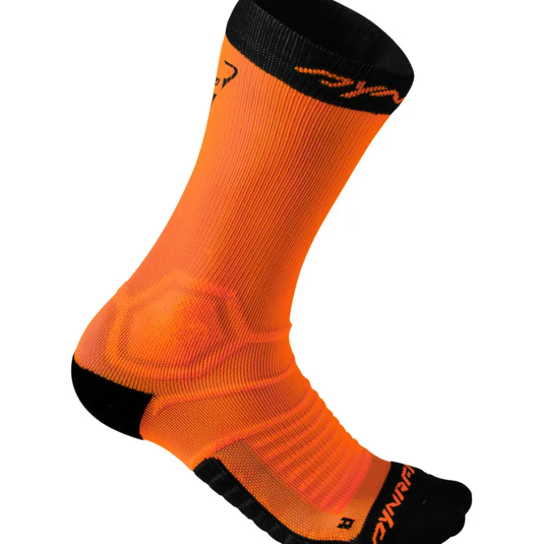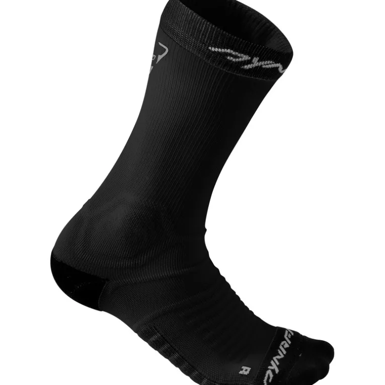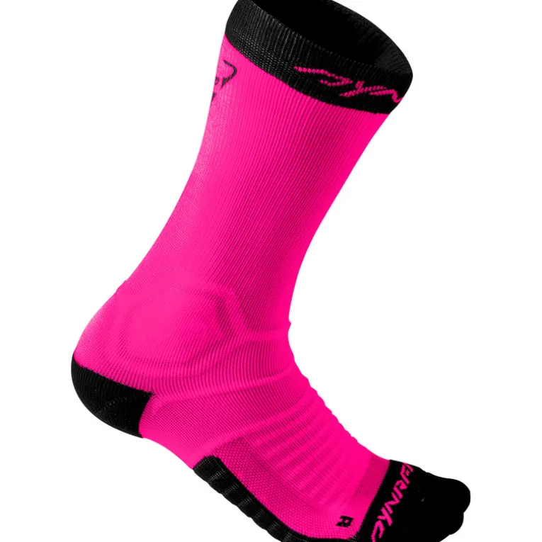 Die Dynafit Ultra Cushion Socken sind enggestrickte Laufsocken mit neu entwickelter 3D Polsterung an Sohle, Ferse und Zehen. Durch das nahtlose Design ist die Socke angenehm zu tragen, das Dryarn Material sorgt für hohe Atmungsaktivität und trockene Füße. Die hochgeschnittene, elastische Socke eignet sich für lange, ausdauernde Geländeläufe.