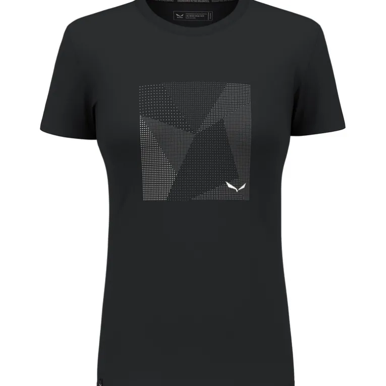 Das Pure Building Dry T-Shirt von Salewa für Damen ist ein atmungsaktives, schnell trocknendes Shirt und Print auf der Brust.