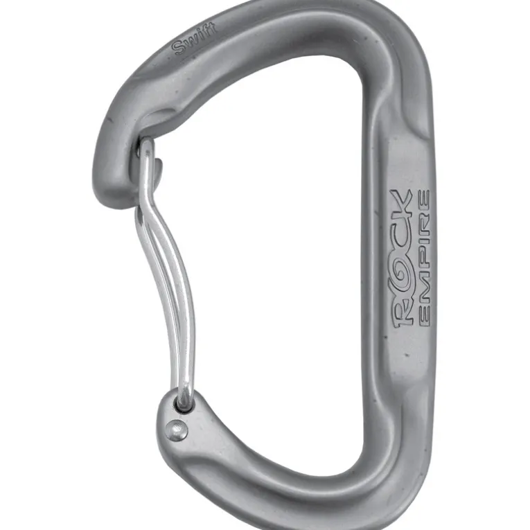 Der Swift Karabiner von ROCK EMPIRE ist ein extrem leichter Karabiner mit Drahtschnappverschluss. Dank der gebogenen Form lässt er sich leicht klippen, der Drahtschnapper hilft, ungewolltes Aufschnappen des Gates beim Gegen-den-Fels-Schlagen zu verringern. Perfekt für die Seilseite in Express-Sets.